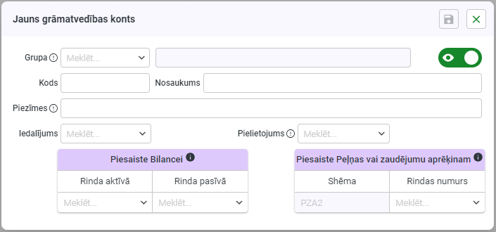 Grupa | Norāda, zem kura konta novietot jauno kontu. Ja jaunais konts ir pirmā līmeņa konts, tad šeit jānorāda "-". Sarakstā būs redzami visi konti ar pielietojumu "Grupēšanai". Vairāk par grupas kontiem ŠEIT. |
