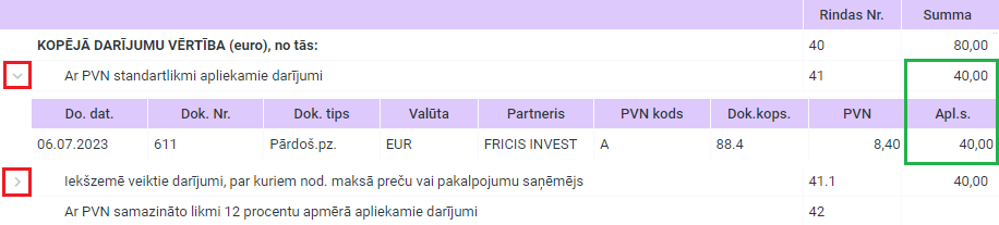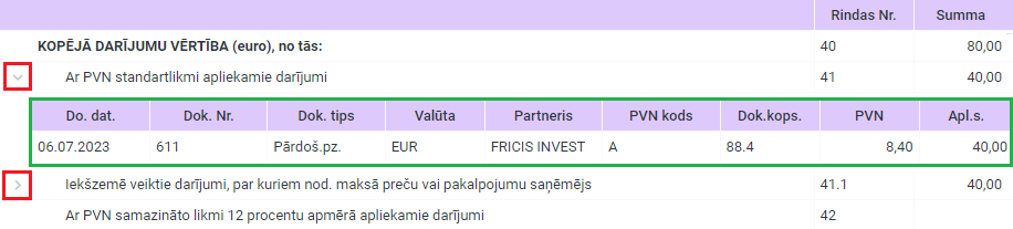 PVN deklarācijā, katrai rindai, kurā ir aprēķināta summa un kura nav kopsummas rinda, ir pieejams izvērsums pa dokumentiem.