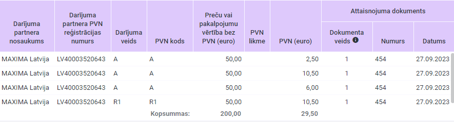 No SIA Maksima Latvija (LV40003520643) saņemta preču pavadzīme par saimnieciskās darbības nodrošināšanai iegādātām saimniecības precēm. Iegādātas preces kas apliekas gan ar PVN standartlikmi, gan ar PVN samazinātajām likmēm 12% un 5%, kā arī pavadzīmē ir prece kurai piemēro reverso nodokļa maksāšanas kārtību (piemēram kokmateriāli). Pieņemsim, ka katras preces vērtība ir 50.00 EUR bez PVN, kas veido kopējo vērtību bez PVN 200.00 EUR.