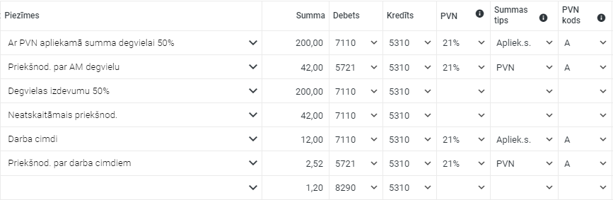 Kā piemērā redzams, katram PVN režīmam veidojas pāri - kontējumu rinda ar summas tipu "Apliek.s." un rinda ar "PVN" summu. Tādējādi tiek nodrošināts, ka PVN1 tiks korekti atspoguļota gan darījuma vērtība bez nodokļa, gan arī PVN summa.