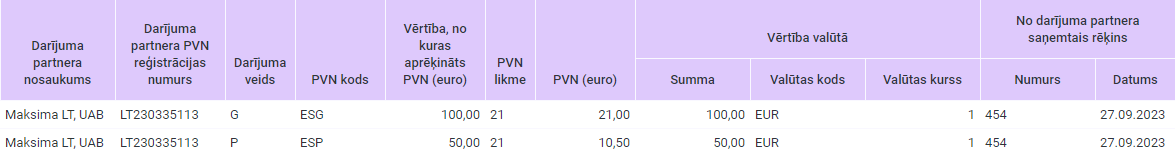No Lietuvā reģistrēta PVN maksātāja UAB Maxima LT (LT230335113) saņemta pavadzīme par preču iegādi ES 100.00 EUR vērtībā. Pavadzīmē iekļauts arī pakalpojums 50.00 EUR vērtībā. Piemērota reversā nodokļa maksāšanas kārtība.