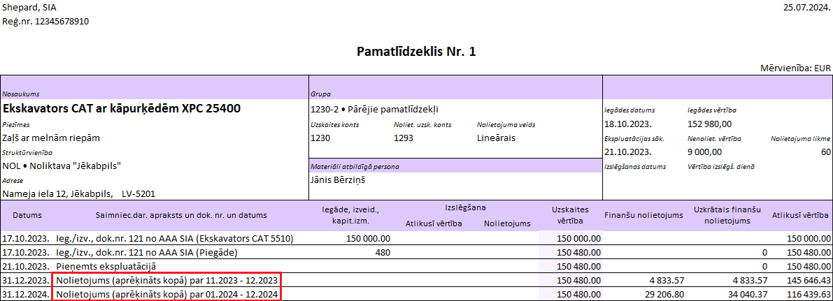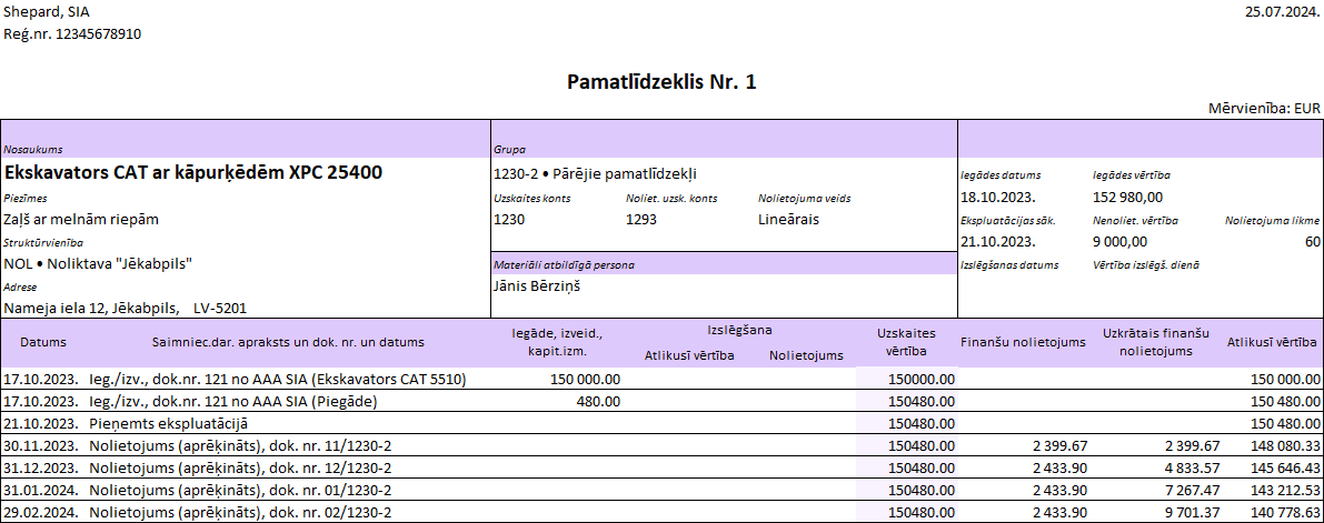 Parastā pamatlīdzekļa kartītes izdruka satur pamata informāciju par pamatlīdzekli un ar to veiktajām darbībām, katru notikumu uzrādot savā rindā, tabulas apakšējā daļā: