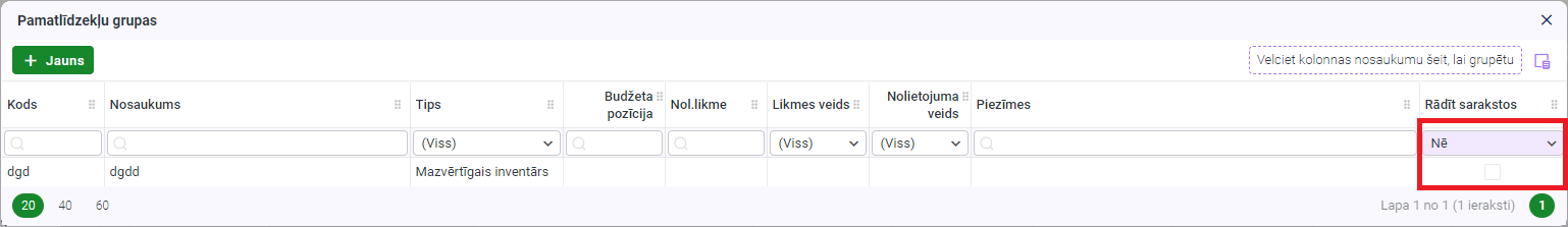 Pēc noklusējuma, pamatlīdzekļu grupu sarakstā tiek rādītas grupas, kuras netiek slēptas. Slēptās grupas var redzēt, veicot atlasi kolonnā "Rādīt sarakstos" -> Nē.